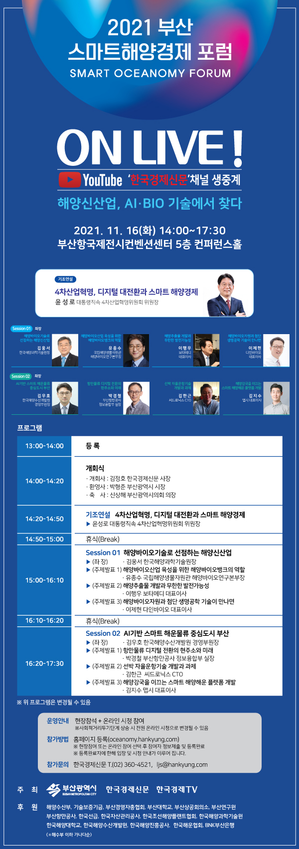 부산광역시와 한국경제신문, 한국경제TV가 공동으로 오는 11월 16일에 「2021 부산 스마트해양경제 포럼」을 개최합니다. 많은 분들의 관심 부탁 드립니다.