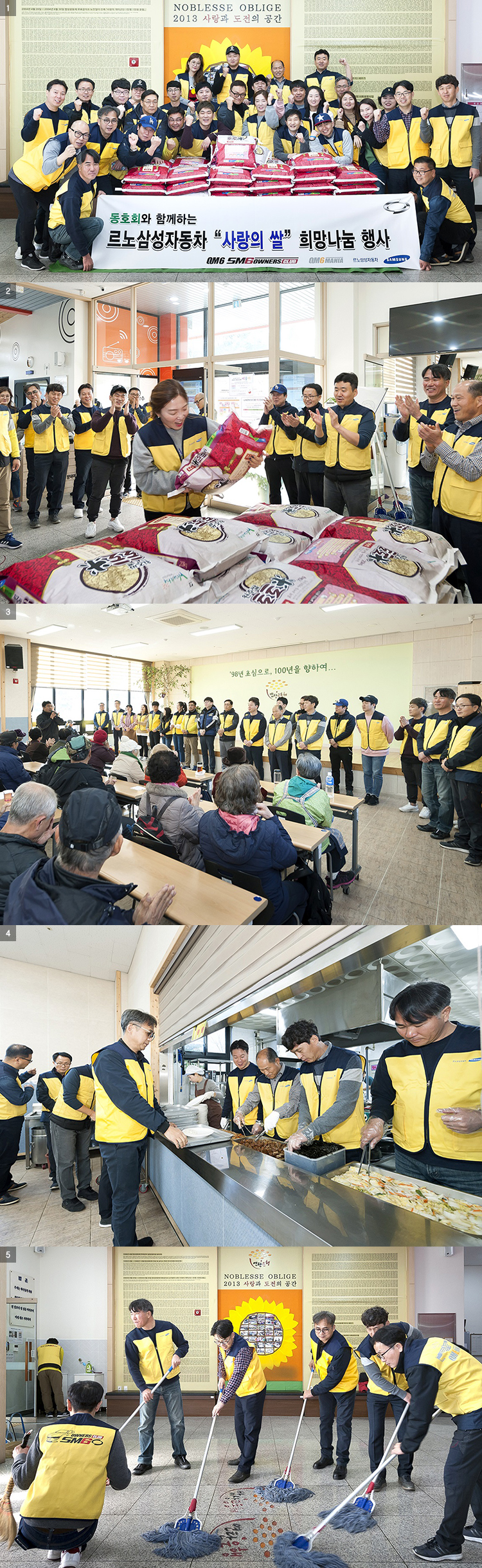 올해도 르노삼성자동차 임직원 12명과 동호회 회원 20명이 모여 사랑의 쌀 2톤을 전달하고 무료 점심 배식 등의 활동을 진행하며 연말을 앞두고 소외된 이웃을 찾아 나눔을 실천했다.