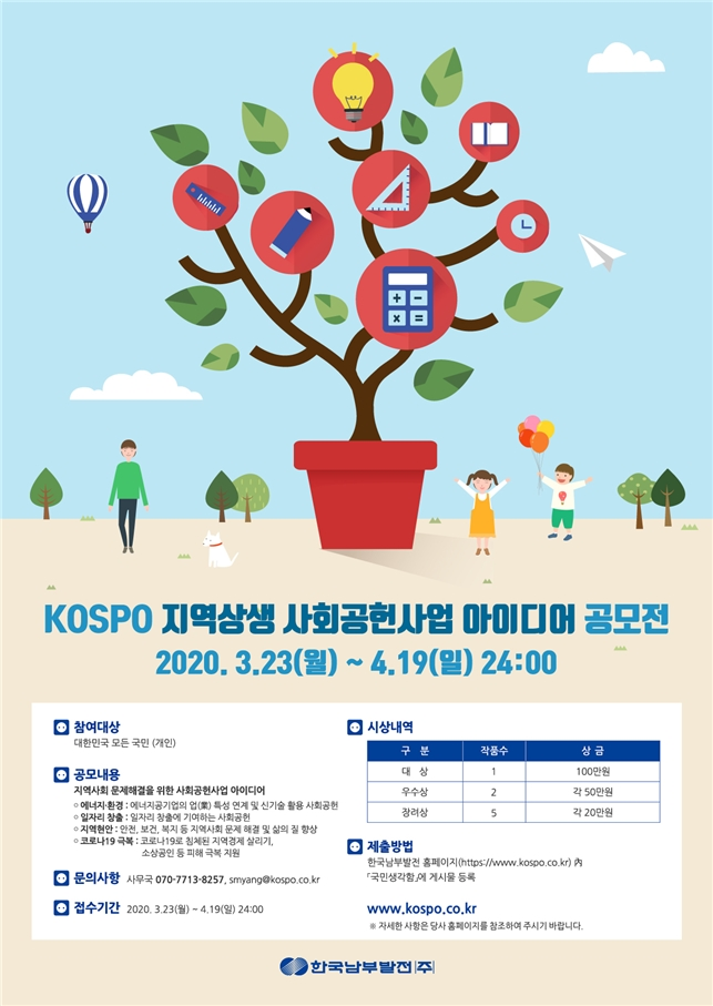 한국남부발전(주)는 3월 23일부터 4월 19일까지 홈페이지를 통해 지역상생 사회공헌 아이디어를 모집한다. 한국남부발전은 국민의 생각에서 지역 현안 해결을 위한 아이디어를 모으고, 지역상생형 사회공헌사업 추진을 위해 ‘KOSPO 지역상생 사회공헌사업 아이디어 공모전’을 시행한다고 지난 3월 23일 밝혔다. 대한민국 모든 국민이 참여 가능한 이번 아이디어 공모전은 ▲에너지·환경 ▲일자리 창출 ▲지역 현안 ▲코로나19 극복 등 4개 분야에 대한 아이디어를 모집한다. 단순 일회성 현금이나 현물 지원사업은 제외되며, 에너지공기업 특성 연계나 지역 현안 해결을 위한 사회공헌 아이디어를 응모하면 된다. 응모 아이디어는 내·외부 심사와 SNS 대국민 설문조사를 통해 수상작으로 확정된다. 남부발전은 대상 1점 100만원, 우수상 2점 각 50만원, 장려상 5점 각 20만원을 상금으로 지급할 예정이다. 아이디어 응모 및 공모전 관련 자세한 사항의 확인은 남부발전 홈페이지(https://www.kospo.co.kr) 내 ‘국민생각함’에서 가능하며, 기타 문의는 사무국(070-7713-8257)으로 하면 된다.