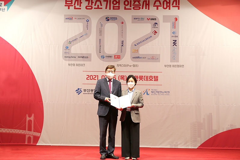 ‘부산형 히든챔피언’은 부산광역시와 (재)부산테크노파크가 글로벌 기업으로서의 성장잠재력과 혁신성을 겸비한 우수한 기업을 발굴하여 수여하는 인증으로, 부산 경제의 혁신 성장과 지역 발전 주도를 통해 고급 일자리 창출을 견인할 수 있는 기업을 선정해 지원하는 사업이다.